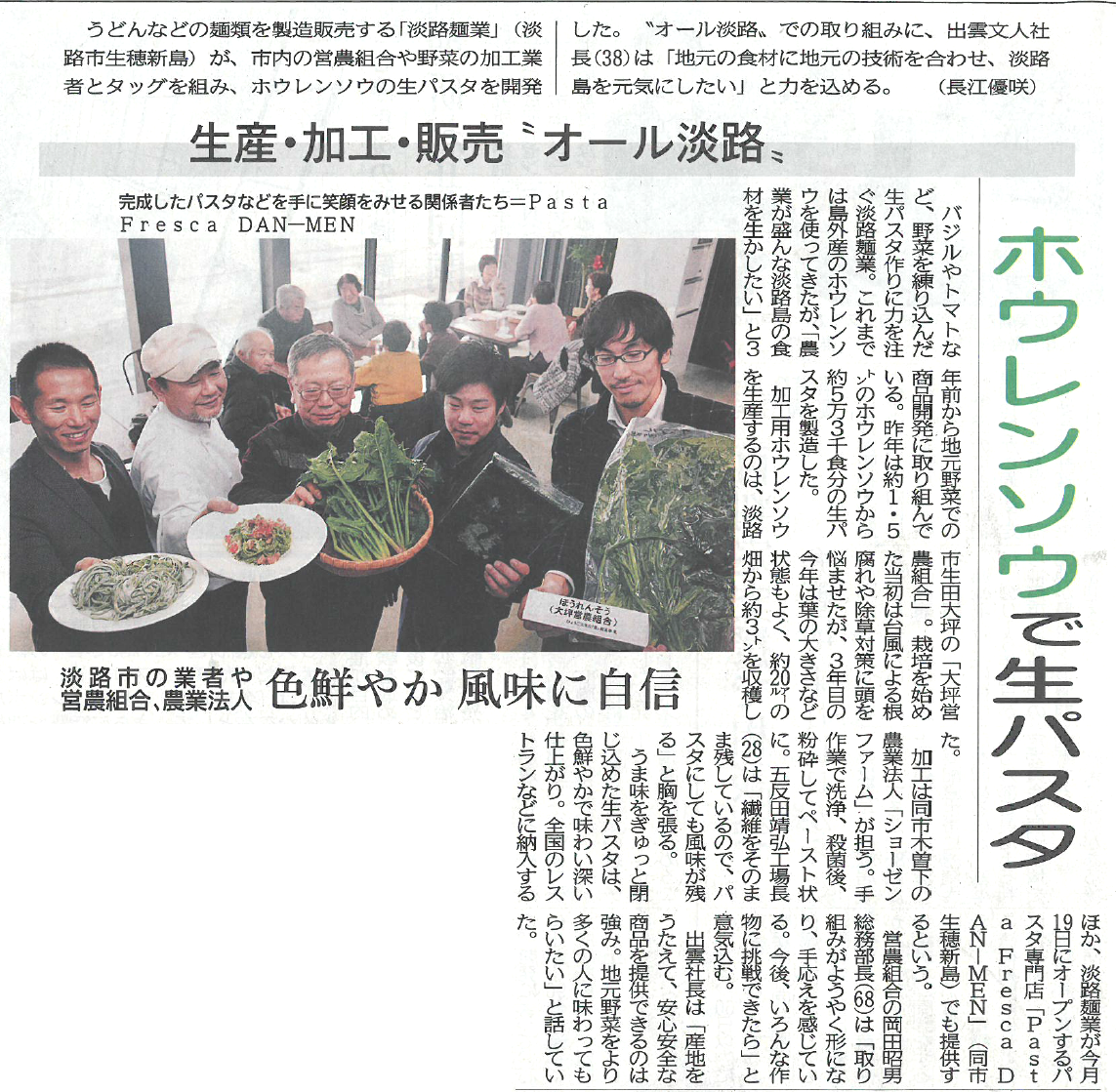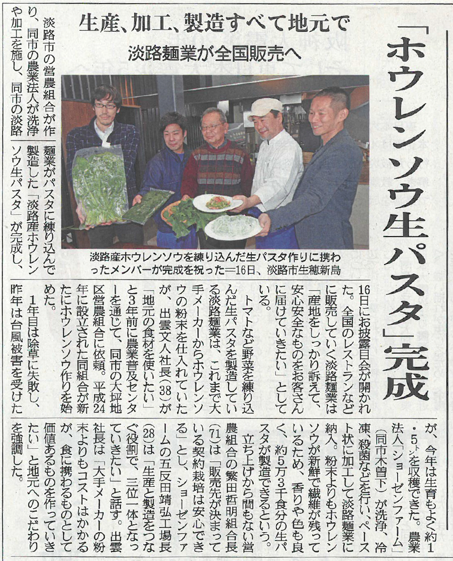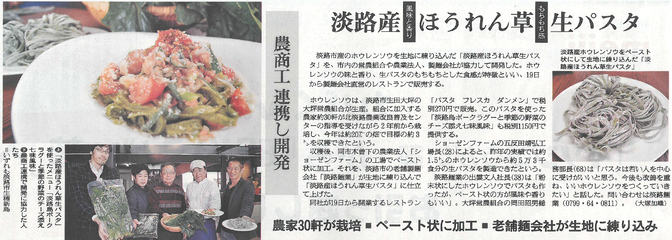 淡路島ほうれん草生パスタの取組が新聞各社に掲載されました!