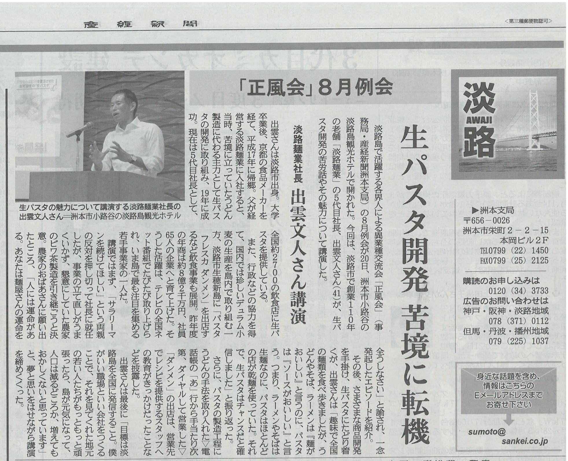 8月22日付の産経新聞に「淡路島で活躍する各界人による異業種交流会での社長講演」の記事が掲載されました。